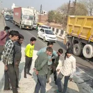 धौलपुर ।जिले के राष्ट्रीय राजमार्ग संख्या 44 आगरा-मुंबई पर शनिवार दोपहर एक डस्ट से भरा ट्रक पलट गया। इस दुर्घटना के कारण ग्वालियर से आगरा की ओर जाने वाली साइट पर वाहनों की लंबी लाइन लग गईं और यातायात बाधित हो गया।स्थानीय लोगों के अनुसार, ट्रक ग्वालियर से आगरा की ओर जा रहा था। ओवरब्रिज के पास आगे चल रहे एक बाइक सवार को बचाने के प्रयास में ट्रक चालक ने स्टीयरिंग मोड़ दी। इससे ट्रक अनियंत्रित होकर पलट गया।ट्रक पलटने से ट्रक में भरी डस्ट सड़क पर डस्ट फैल गई, जिससे वाहनों की आवाजाही पूरी तरह रुक गई और जाम लग गया। ग्वालियर से आगरा की ओर जाने वाले सभी वाहन हाईवे पर ही फंस गए।जाम की सूचना मिलते ही यातायात प्रभारी बलविंदर सिंह अपनी टीम के साथ मौके पर पहुंचे। ट्रैफिक पुलिसकर्मियों की मदद से पलटे हुए ट्रक को हटाया गया और बाधित यातायात को सुचारु कराया ।
