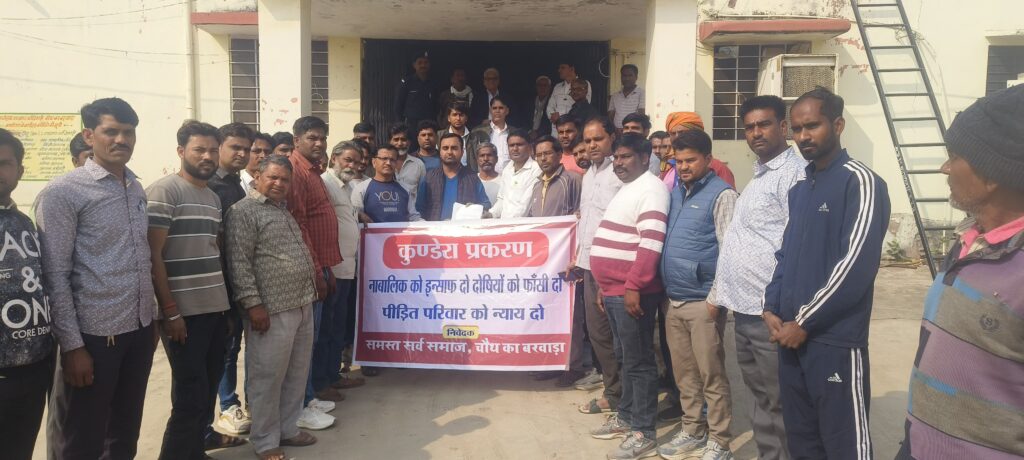 कुंडेरा थाना क्षेत्र में करीब 1 साल से एक नाबालिक बालिका गायब थी। एक महीने पहले वह बंबोरी अंडरपास में मिली। समाज के लोगों ने बताया कि बालिका के मिलने के बाद पुलिस ने बयान भी दर्ज कर लिए हैं। इसके बावजूद अभी तक इन बयानों को लेकर कोई कार्रवाई नहीं की गई है। लोगों की मांग है कि बालिका ने जो बयान दिए हैं। उनकी जांच कर उनमें जो अपराधी है। उनको जल्द से जल्द गिरफ्तार किया जाए। इसी को लेकर सर्व समाज के लोग बुधवार सुबह नारेबाजी करते हुए चौथ का बरवाड़ा एसडीएम कार्यालय में पहुंचे। यहां एसडीएम जोगेंद्र सिंह को उक्त मामले की कार्रवाई के लिए मुख्यमंत्री के नाम ज्ञापन दिया गया। ज्ञापन में लोगों ने बताया कि यदि जल्द से जल्द मामले को लेकर कार्रवाई नहीं की जाती है तो कर समाज का लोग आंदोलन करने पर विवश होगा। इस दौरान मौके पर भाजपा मंडल अध्यक्ष बाबूलाल सैनी, भाजपा मंडल महामंत्री रमेश चंद सैनी, कांग्रेस सेवा दल ब्लॉक अध्यक्ष शंकरलाल सैनी माली समाज अध्यक्ष राधेश्याम सैनी, हेमराज सैनी, महावीर प्रसाद सैनी, दीपक कुमार सैनी, कालूराम मीणा, चेतराम गुर्जर एडवोकेट विनोद कुमार सैनी अमीन खान आदि मौजूद रहे।